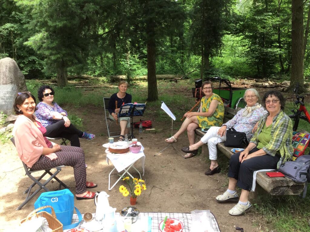 Das Wetter war sehr angenehm. Wir haben uns im Schwanheimer Wald an einem schönen Platz getroffen. Es wurde viel erzählt, Flöte und Mundharmonika gespielt und ein Gedicht aus der Kindheit in der Natur vorgelesen. Ein vorbeikommender Wanderer hat uns ein Gedicht über den Wald vorgetragen.