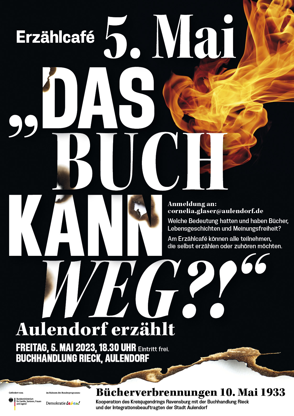 Anlässlich des 90. Jahretages der Bücherverbrennung in vielen Deutschen Städten 1933 veranstaltete der Kreisjugendring Ravensburg e.V. an einem Wochenende in drei Orten Erzählcafés in Zusammenarbeit mit den jeweiligen Integrationsbeauftragten, zwei Stadtbibliotheken und einer Bücherei. Die Kooperation erwies sich als besonders fruchtbar und die Erzählcafés waren gut besucht. Das Erzählcafé drehte sich um den Wert von Büchern, gestern und heute.
