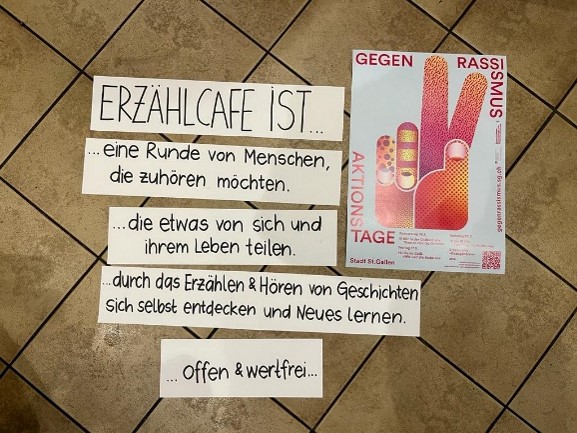Wir haben in Rorschach im Gesprächskarussell (Zusammen mit Katarina Stigwall, HEKS Beratungsstelle gegen Rassismus und Diskriminierung) und am Dienstagnachmittag im Frauencafé (Zusammen mit Tina Peschko, HEKS Beratungsstelle gegen Rassismus und Diskriminierung) Erzählcafés zum Thema «Dazugehören» durchgeführt. Die Erzählcafés fanden im Rahmen der Aktionswoche gegen Rassismus 2023 in St.Gallen statt und wurden vom Kanton St.Gallen mit dem Förderbeitrag für Integrationsprojekte gefördert.