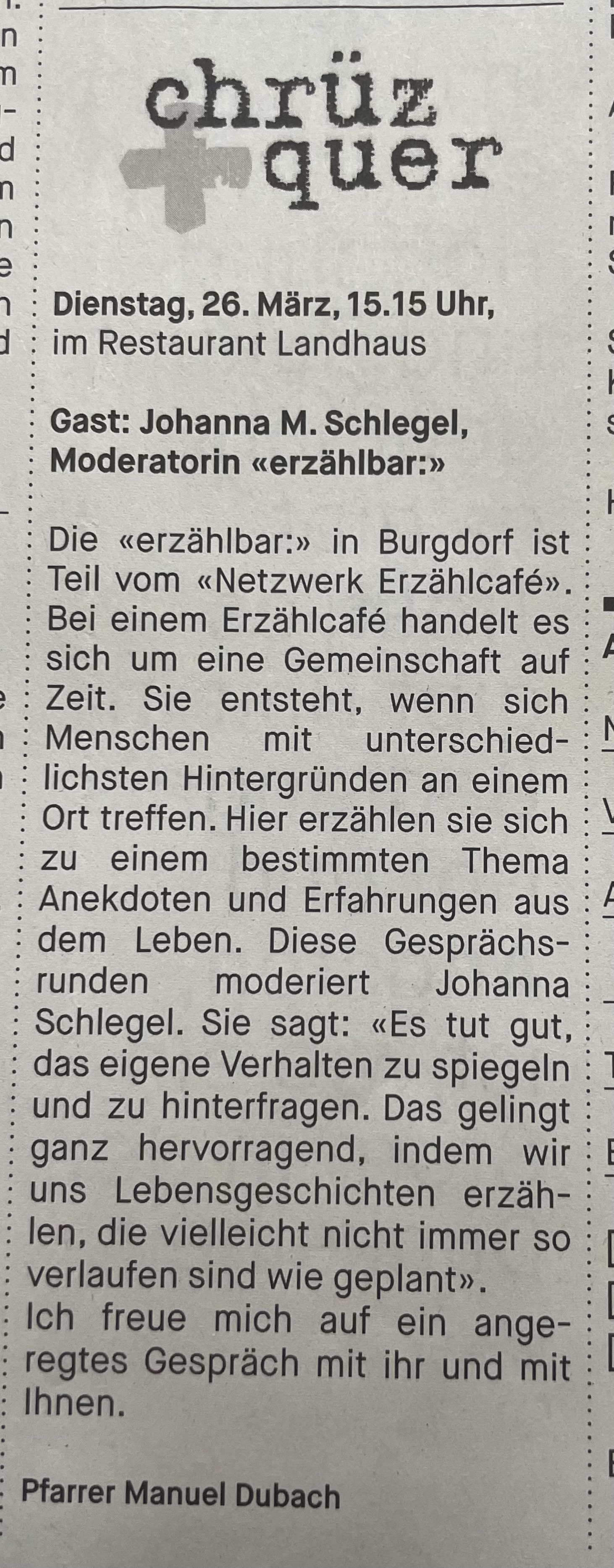 Ich darf an einem der monatlichen chrüz + quer dank Pfarrer Manuel Dubach der reformierten Kirche Burgdorf das Erzählcafé vorstellen - ich freue mich auf neue Kontakte!